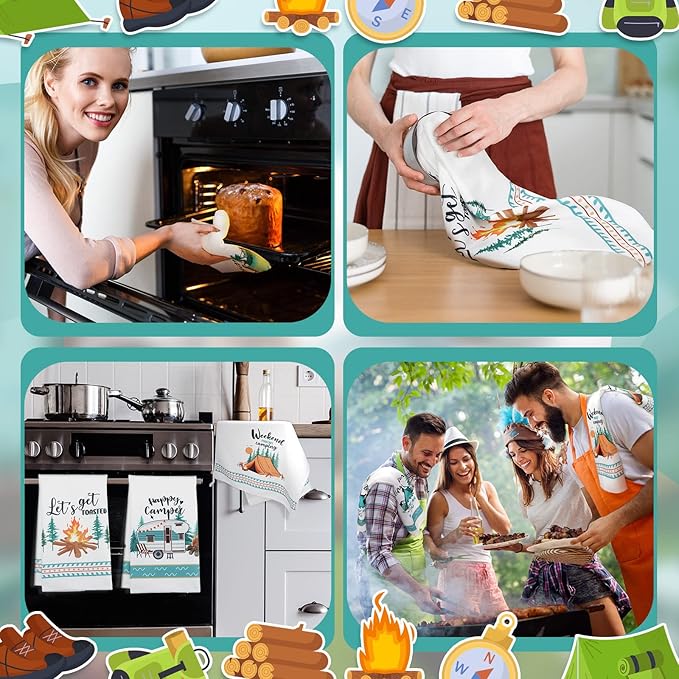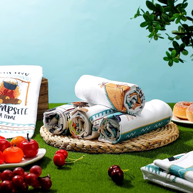 Set of 6 Camping Kitchen Towels White Absorbent Dishcloth Bonfire Tent Car Tea Towels 24 x 16 Inches with Funny Sayings Novelty Gifts for Campers Happy Camper Camping Accessories for Rv Campers