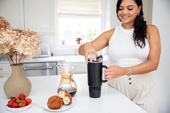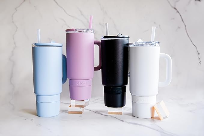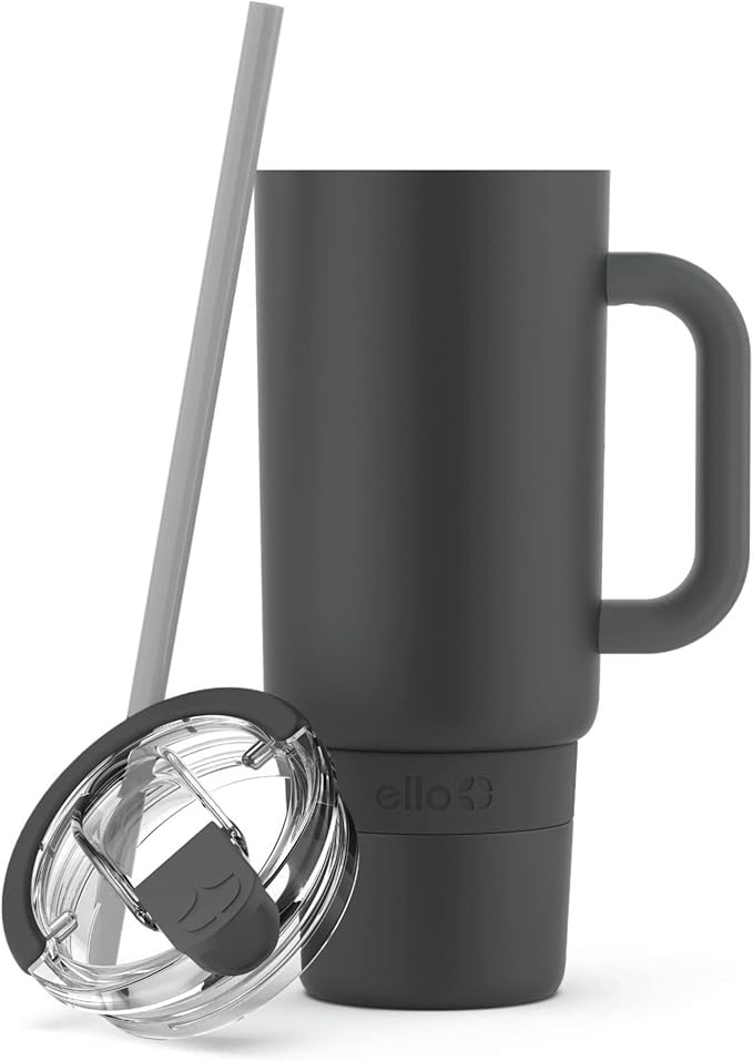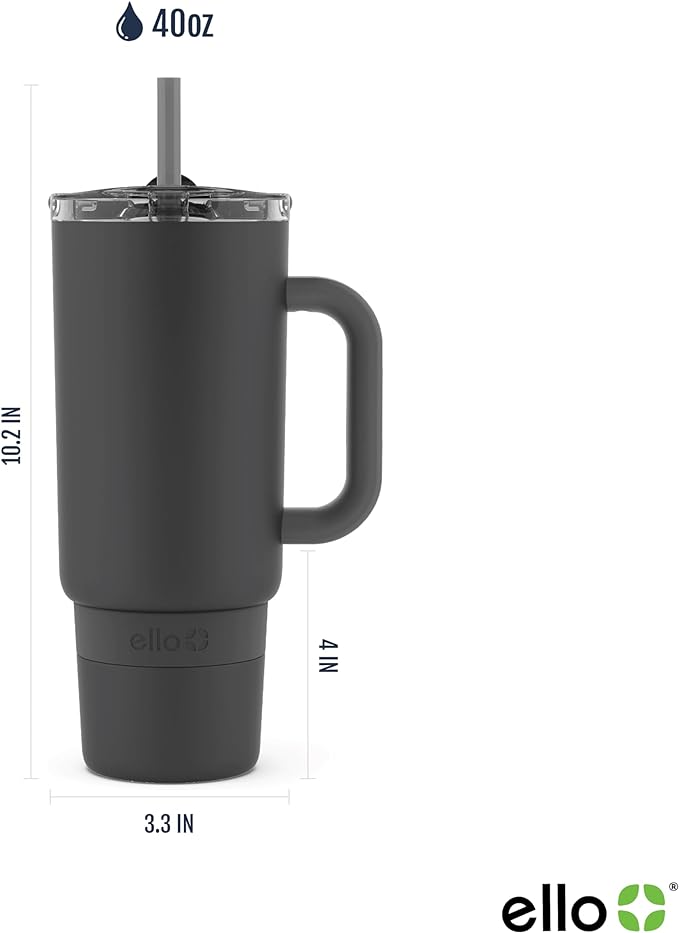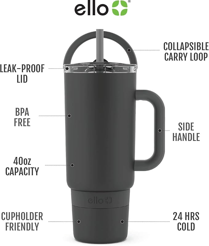 Ello Port 40oz Tumbler with Carry Loop & Integrated Handle, Vacuum Insulated Stainless Steel Reusable Water Bottle, Travel Mug with Leak Proof Lid and Straw, Perfect for Iced Coffee and Tea, Black