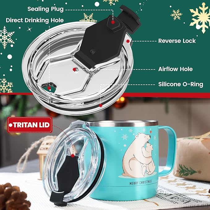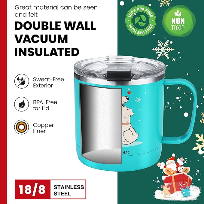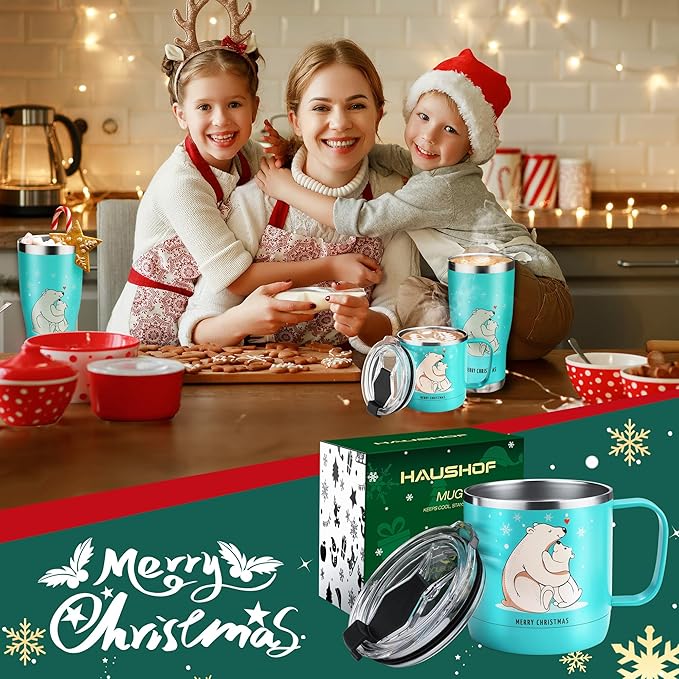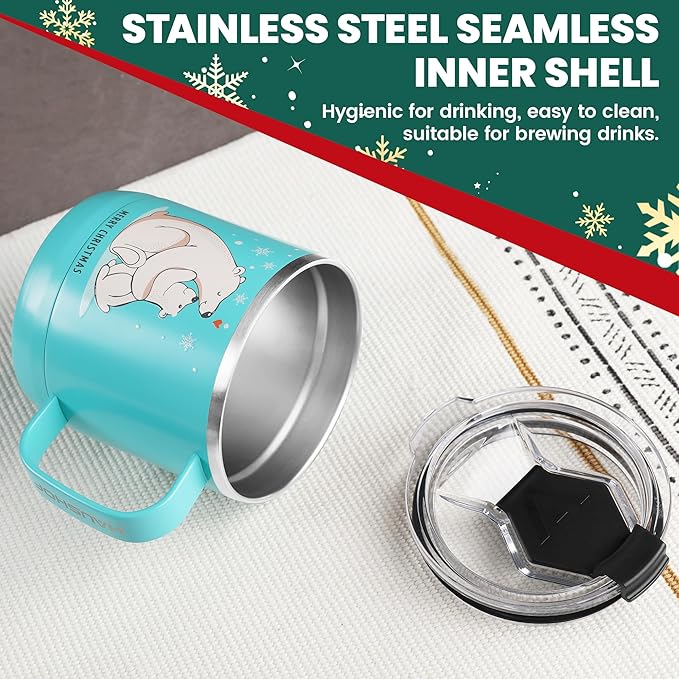 HAUSHOF 14oz Christmas Mug, Stainless Steel Coffee Mugs with Lid and Handle, Insulated Coffee Cups, Ideal Christmas Gifts for Mom, Dad, Kids