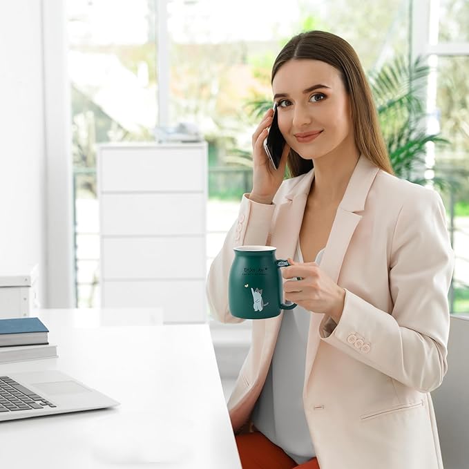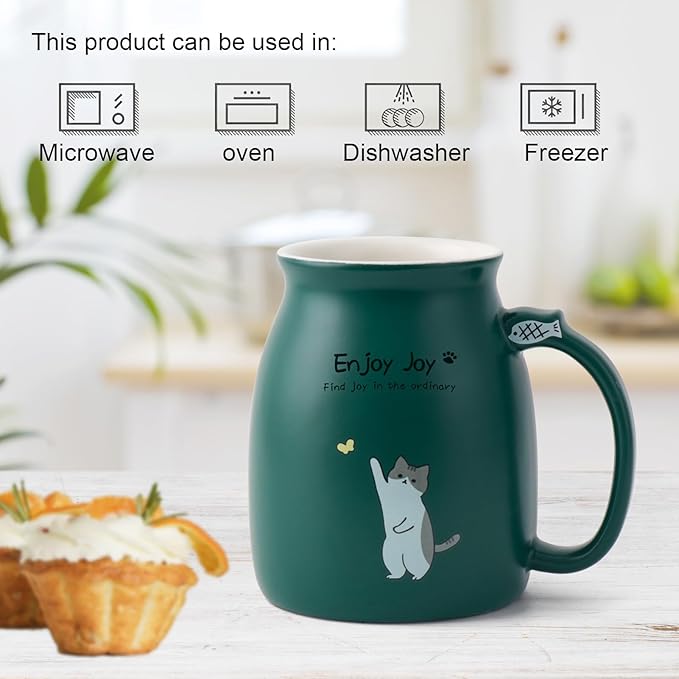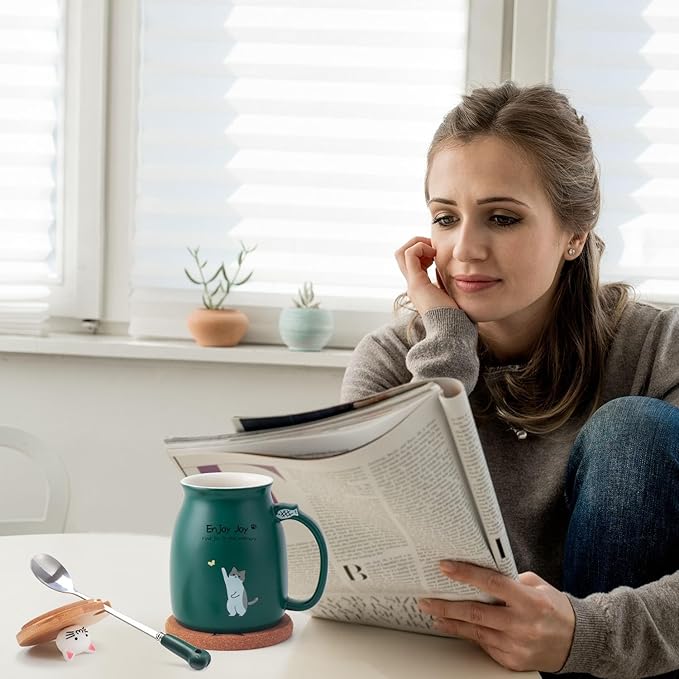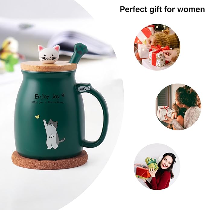 Cute Cat Cup Ceramic Coffee Mug with Kawaii Cat Wooden Lid, Lovely Stainless Steel Spoon, Anime Kitty Thicken Wooden Coaster, Christmas Birthday Cute Thing Japanese Mug 16oz (Green)