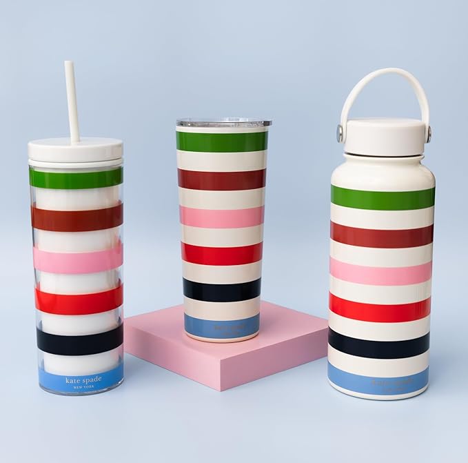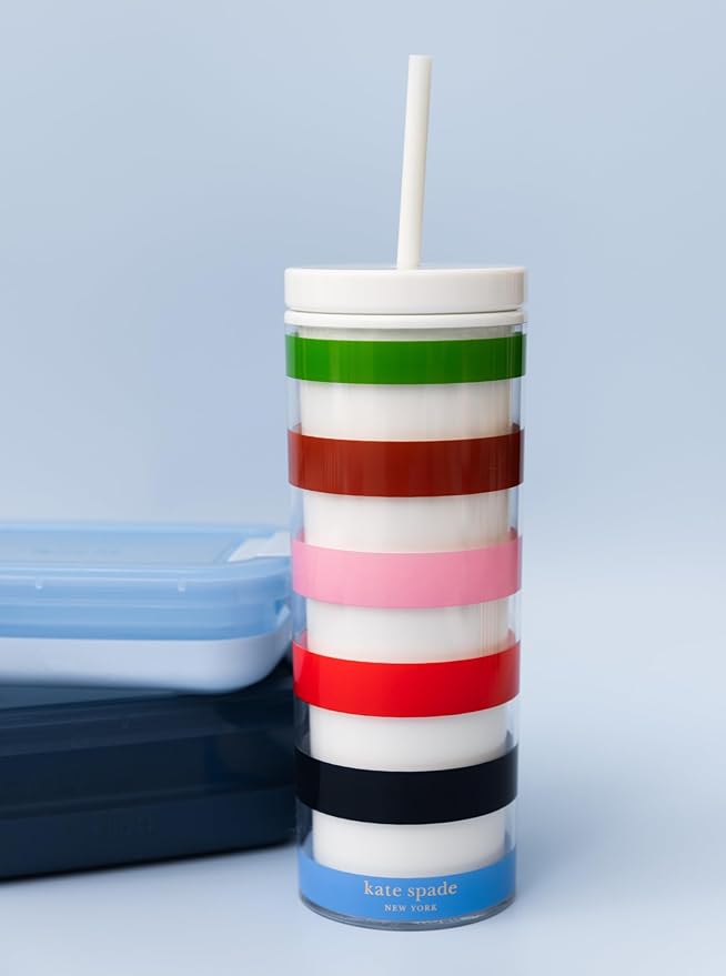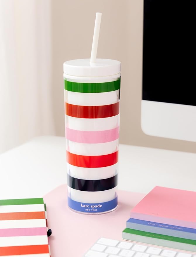kate spade new york Acrylic Tumbler with Lid and Straw, 24 oz Tumbler, Slim Double Wall Tumbler, Adventure Stripe