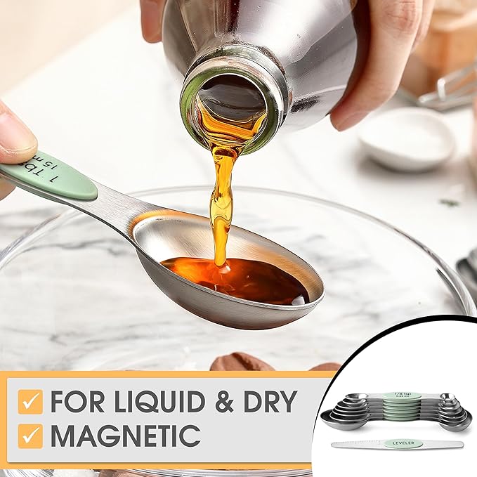 Spring Chef Stainless Steel Magnetic Measuring Spoons Set of 8 with Leveler, Dual Sided Teaspoon & Tablespoon Set, Nesting Metal Kitchen Gadgets for Baking & Cooking, Fits in Spice Jars - Pistachio