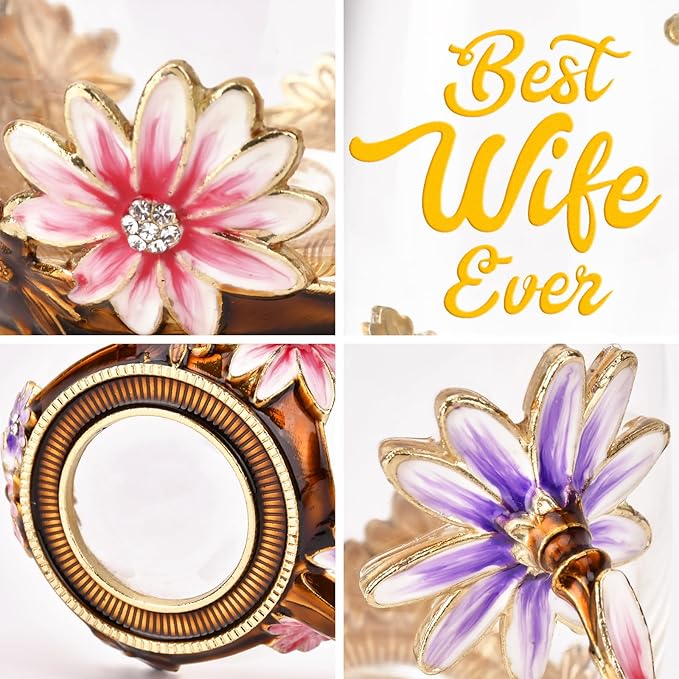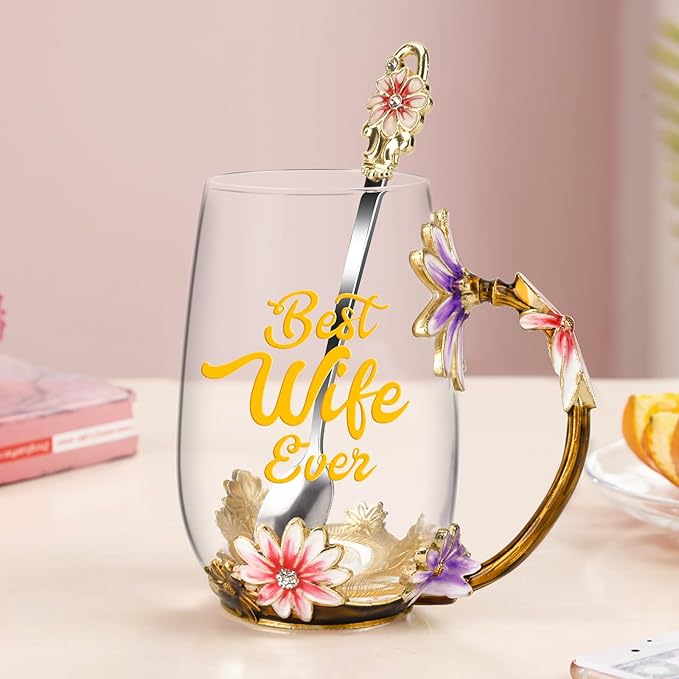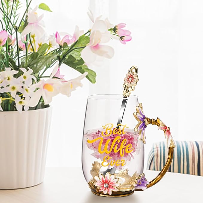OEAGO Gifts for Wife from Husband Romantic Tea Cup Gifts for Her Birthday Flower Glass Mugs Wedding Mothers Day Christmas Anniversary