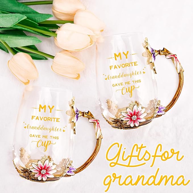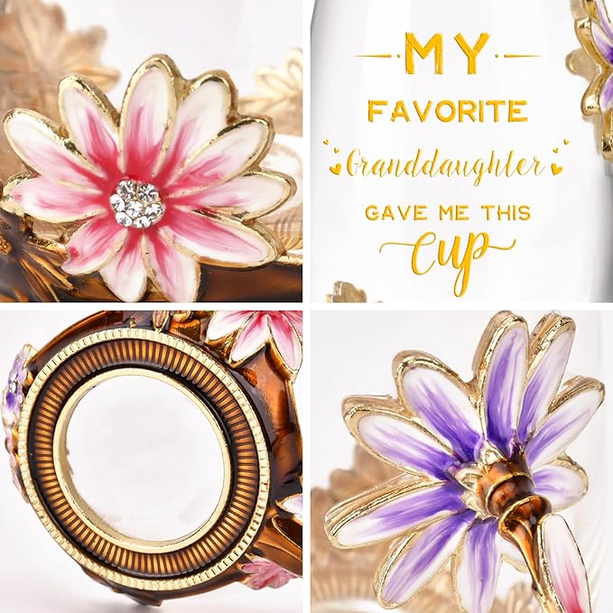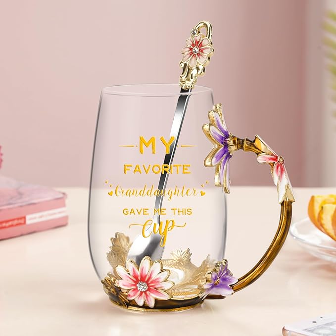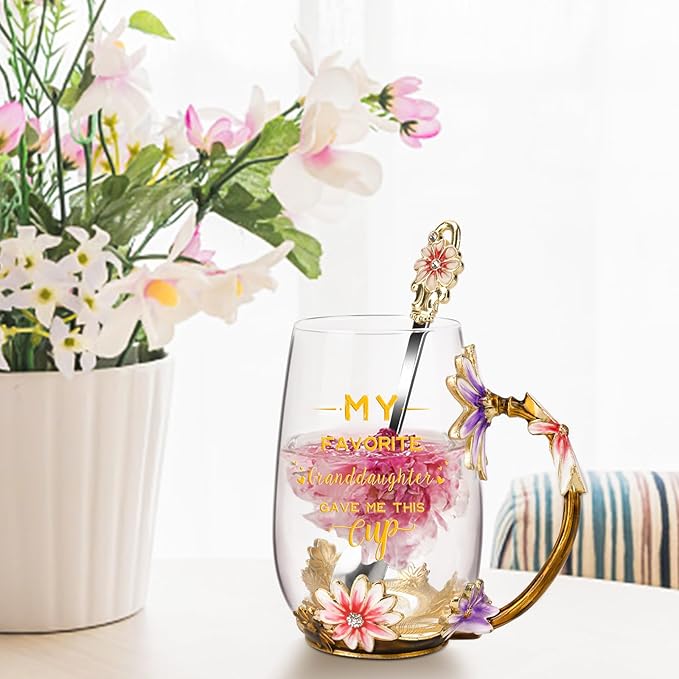 OEAGO Grandma Gifts from Granddaughter Tea Cup Birthday Grandparent Gifts Mothers Day Enamel Flower Glass Mugs from Grandkids Grandchildren