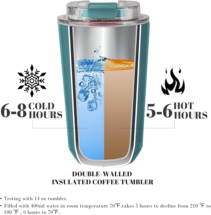 Puraville Insulated Tumblers with Lid, 14 oz Travel Coffee Mug Stainless Steel Vacuum Cup, Leak Proof Reusable Double Walled Coffee Tumbler for Iced and Hot Drinks, Peacock Blue