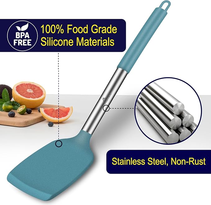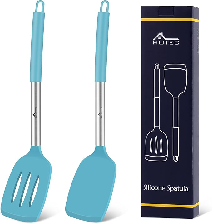 HOTEC Silicone Spatula Set of 2 Heat-Resistant 600°F & BPA-Free Kitchen SaptulaTurner with Stainless Steel Handles, Slotted & Solid Spatulas for Nonstick Cookware, 13.7 Inch, Blue
