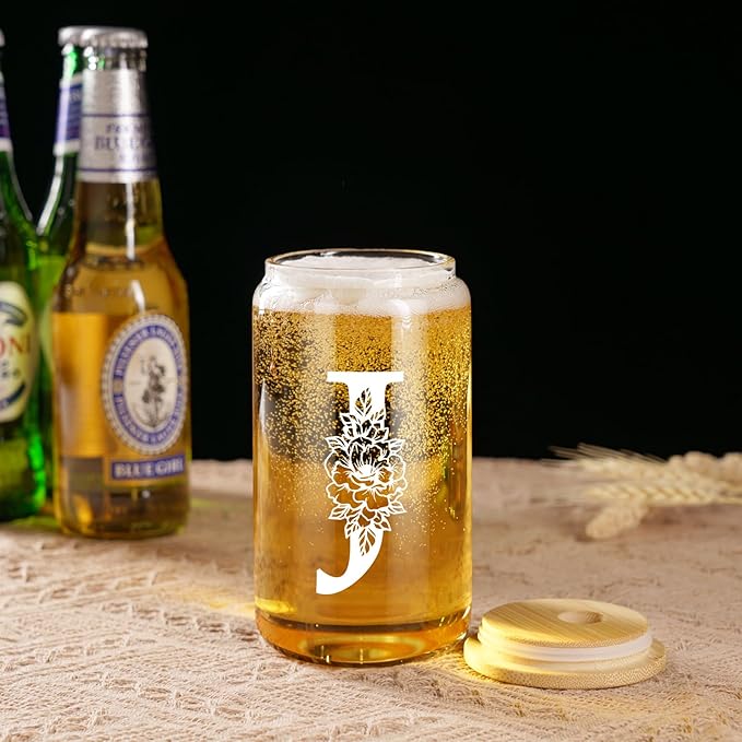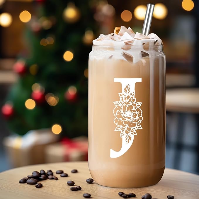 Coolife Initial Glass Cup, Monogrammed Gifts for Women, 16 oz Glass Cups w/Lids Straws, Iced Coffee Smoothie Beer Tumbler w/Straw Lid - Personalized Christmas, Birthday Gifts for Her Mom Friend Woman