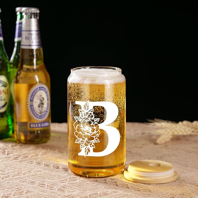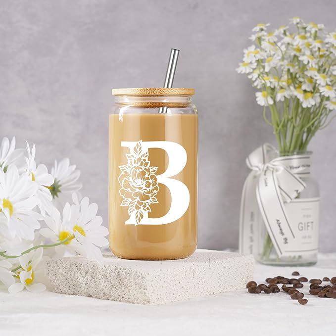 Coolife Initial Glass Cup, Monogrammed Gifts for Women, 16 oz Glass Cups w/Lids Straws, Iced Coffee Smoothie Beer Tumbler w/Straw Lid - Personalized Christmas, Birthday Gifts for Her Mom Friend Woman