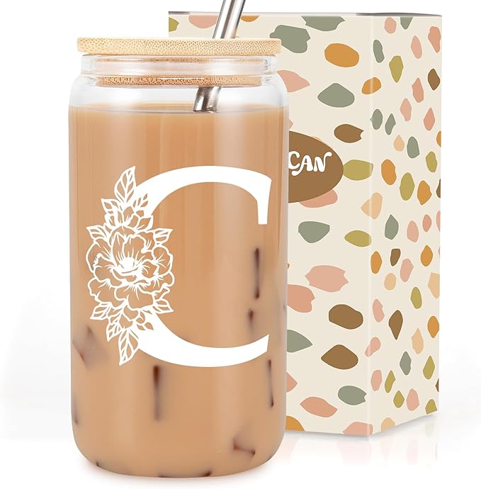 Coolife Initial Glass Cup, Monogrammed Gifts for Women, 16 oz Glass Cups w/Lids Straws, Iced Coffee Smoothie Beer Tumbler w/Straw Lid - Personalized Christmas, Birthday Gifts for Her Mom Friend Woman