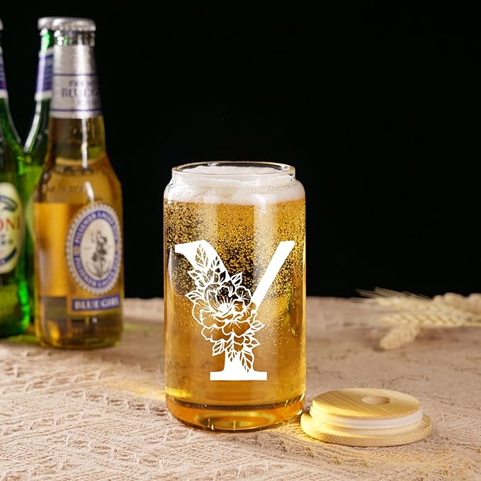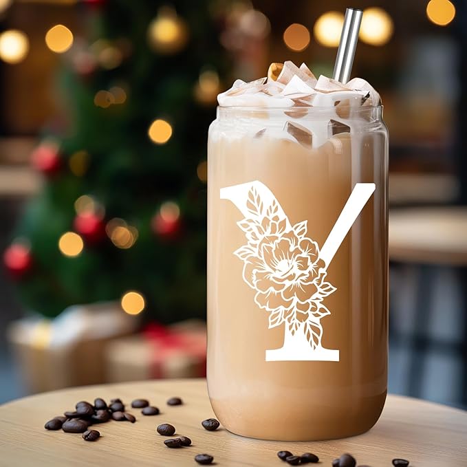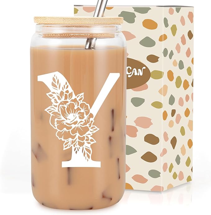 Coolife Initial Glass Cup, Monogrammed Gifts for Women, 16 oz Glass Cups w/Lids Straws, Iced Coffee Smoothie Beer Tumbler w/Straw Lid - Personalized Christmas, Birthday Gifts for Her Mom Friend Woman