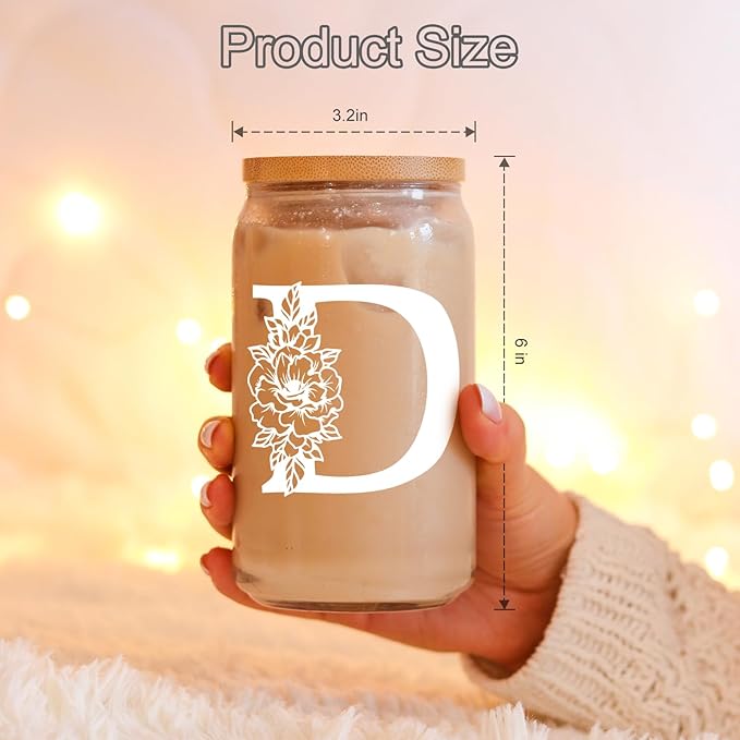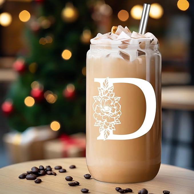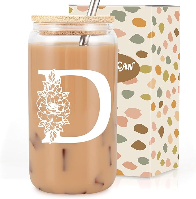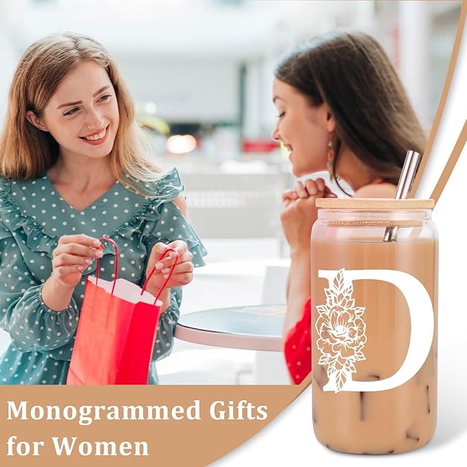 Coolife Initial Glass Cup, Monogrammed Gifts for Women, 16 oz Glass Cups w/Lids Straws, Iced Coffee Smoothie Beer Tumbler w/Straw Lid - Personalized Christmas, Birthday Gifts for Her Mom Friend Woman
