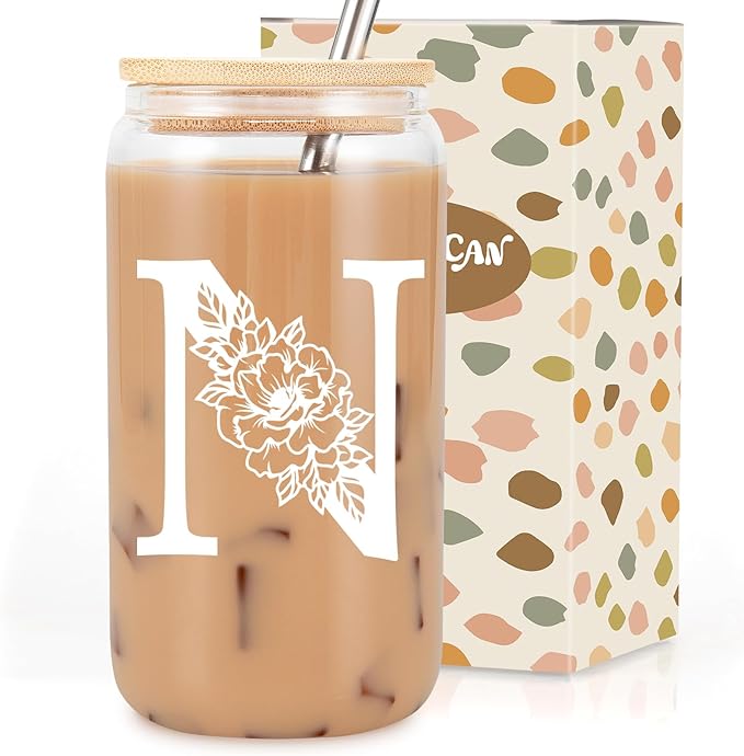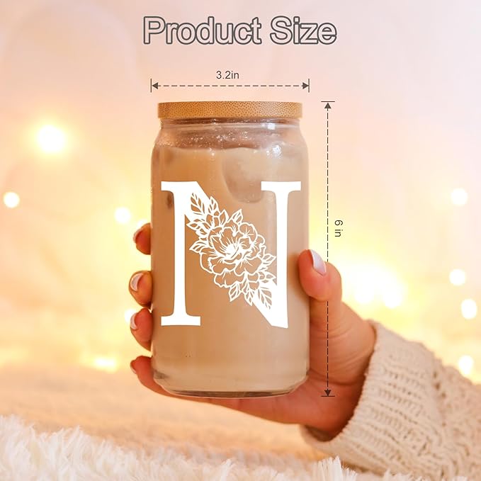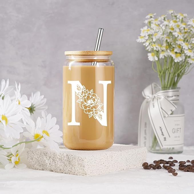 Coolife Initial Glass Cup, Monogrammed Gifts for Women, 16 oz Glass Cups w/Lids Straws, Iced Coffee Smoothie Beer Tumbler w/Straw Lid - Personalized Christmas, Birthday Gifts for Her Mom Friend Woman