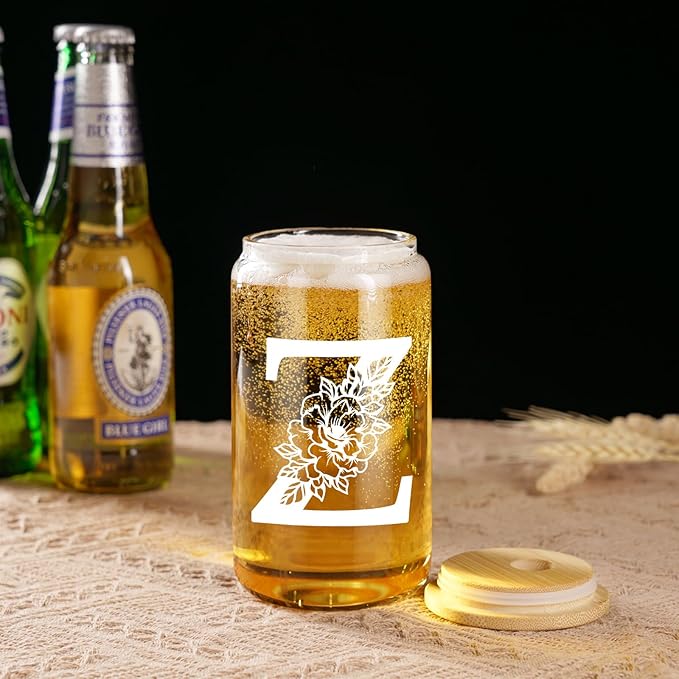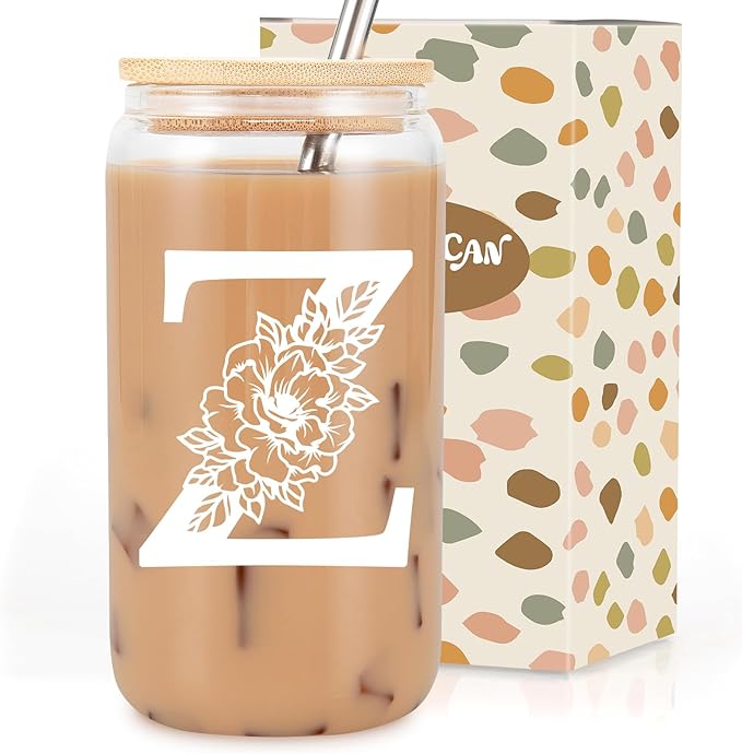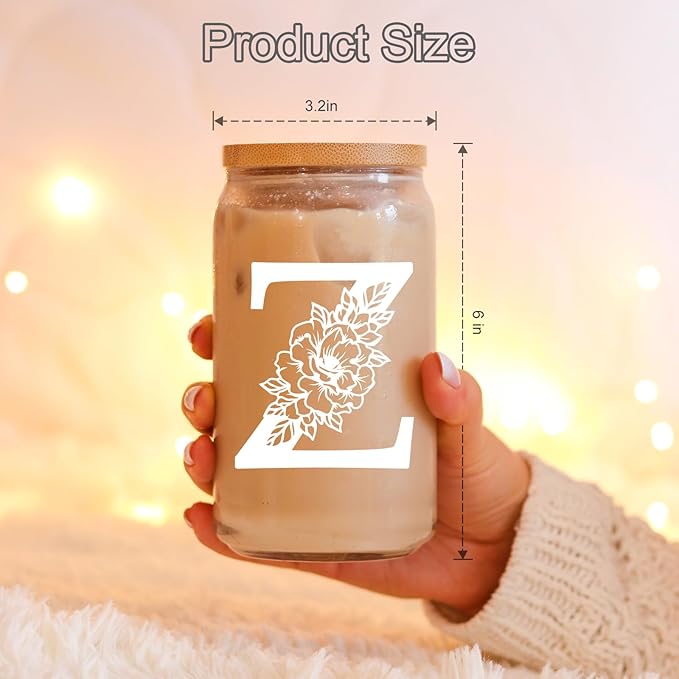 Coolife Initial Glass Cup, Monogrammed Gifts for Women, 16 oz Glass Cups w/Lids Straws, Iced Coffee Smoothie Beer Tumbler w/Straw Lid - Personalized Christmas, Birthday Gifts for Her Mom Friend Woman