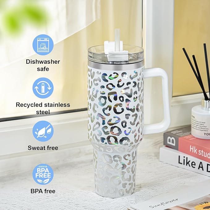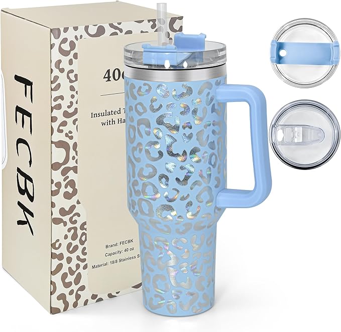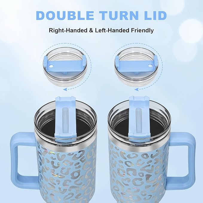 40 oz Tumbler with Handle and Straw, 100% Leak-Proof Travel Mug, Stainless Steel Double Wall Vacuum Insulated Coffee Cup Keeps Cold For 34 Hours, Dishwasher Safe, Hawkes Blue Leopard