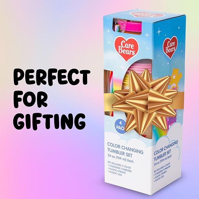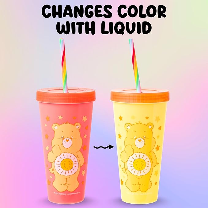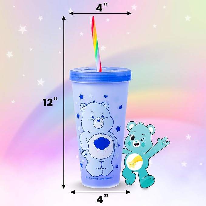 Silver Buffalo Care Bears Hearts and Stars 4 Pack Plastic Color Changing Tumblers with Rainbow Swirl Straws Featuring Tenderheart, Funshine, Cheer, and Grumpy Bear 24 Ounces