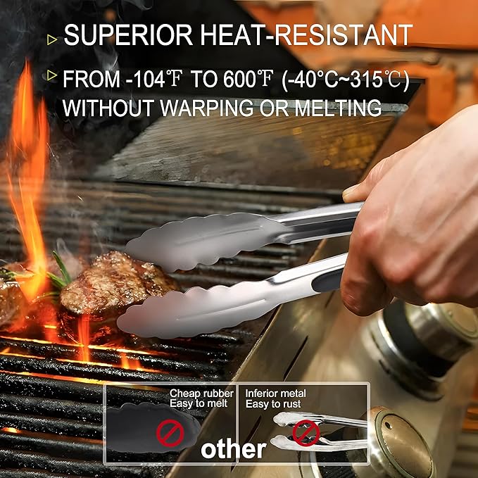 Anaeat Stainless Steel Locking Tong Set of 3 - Premium 7, 9 and 12 inch Kitchen Food Tongs with Non-Slip Silicone Tips and Grip for Serving, Cooking, Baking and BBQ - Heavy Duty & Heat Resistant