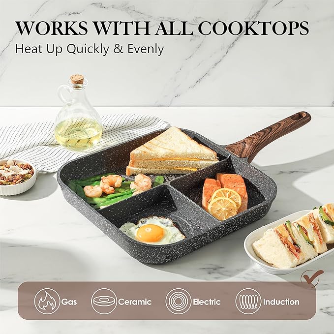 SENSARTE Nonstick Divided Grill Pan for Stove Tops, 3-Section Versatile Breakfast Grilling Pan, Durable Square Grill Skillet, Steak Griddle Pan, PFOA, PFOS, APEO Free, Induction Compatible, 9.5 Inch