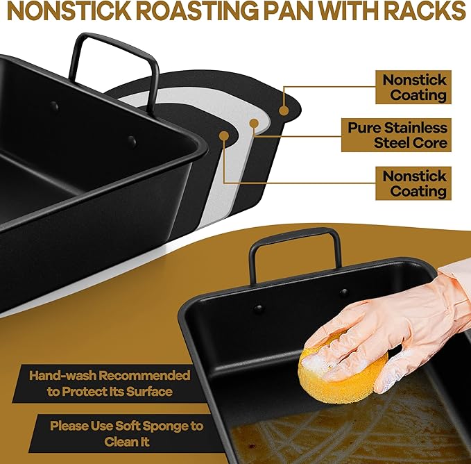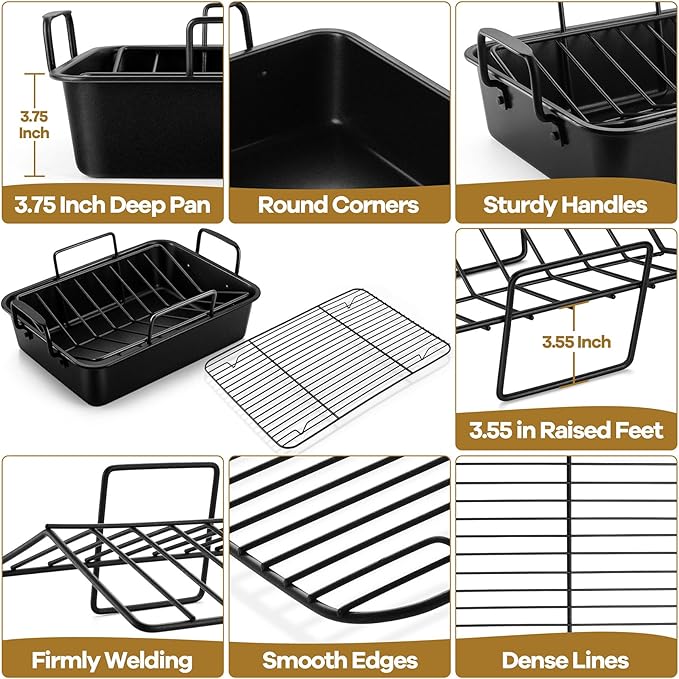 P&P CHEF 16" Roaster Roasting Pan with Baking Rack and V-shaped Rack, Stainless Steel Rectangular Lasagna Pan with Handles for Turkey Chicken, Healthy & Dishwasher Safe, 3 Pieces, Black