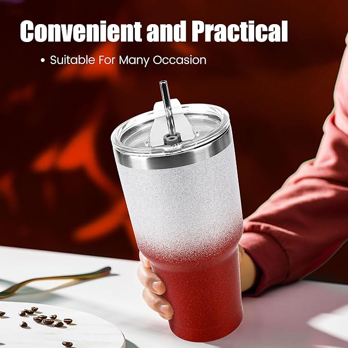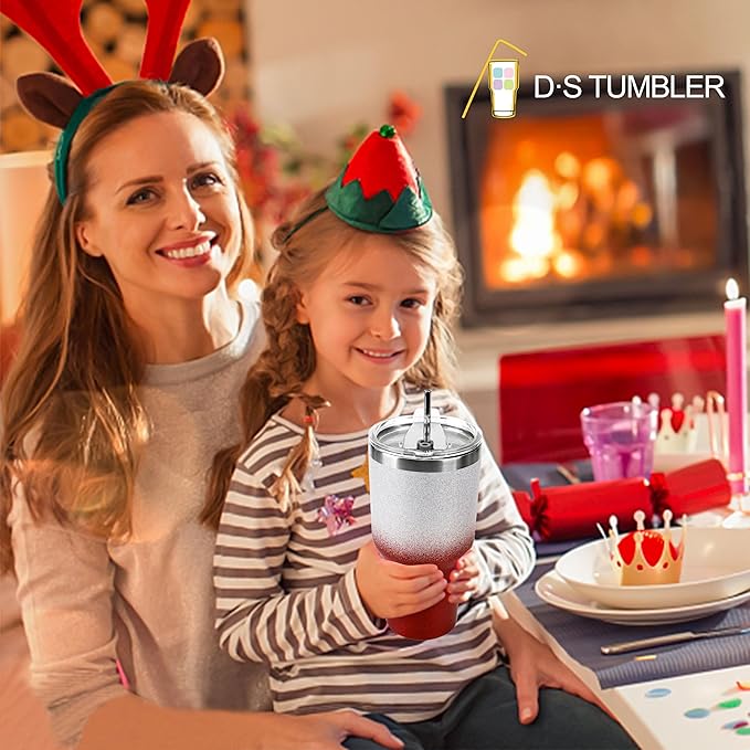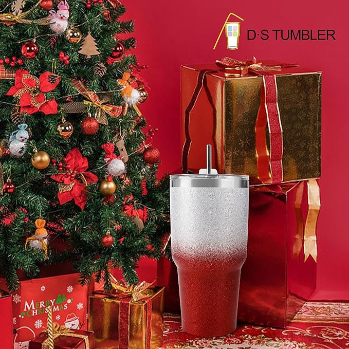 D·S 30 oz Tumbler Christmas Red Glitter Gradient Cup Stainless Steel Double Wall Vacuum Insulated Mug with Straw and Lid, Cleaning Brush for Cold and Hot Beverages