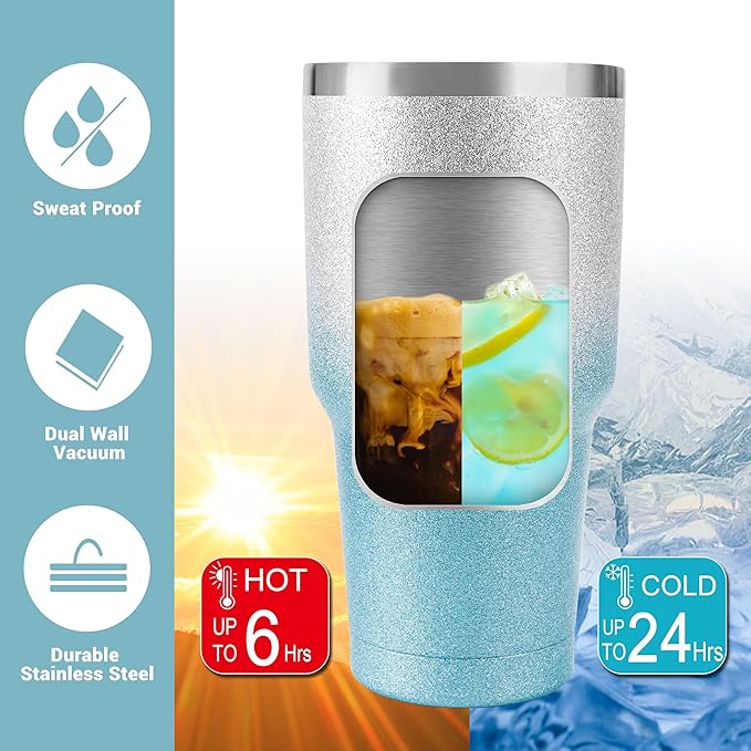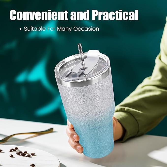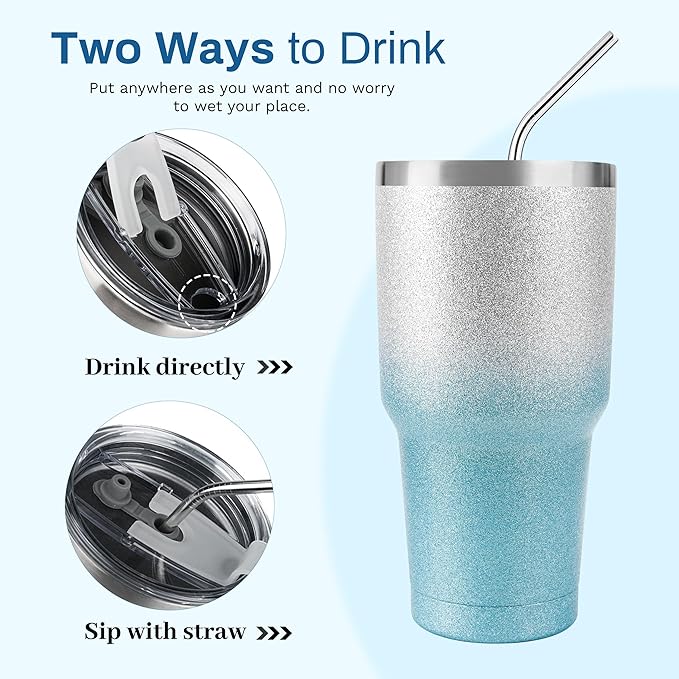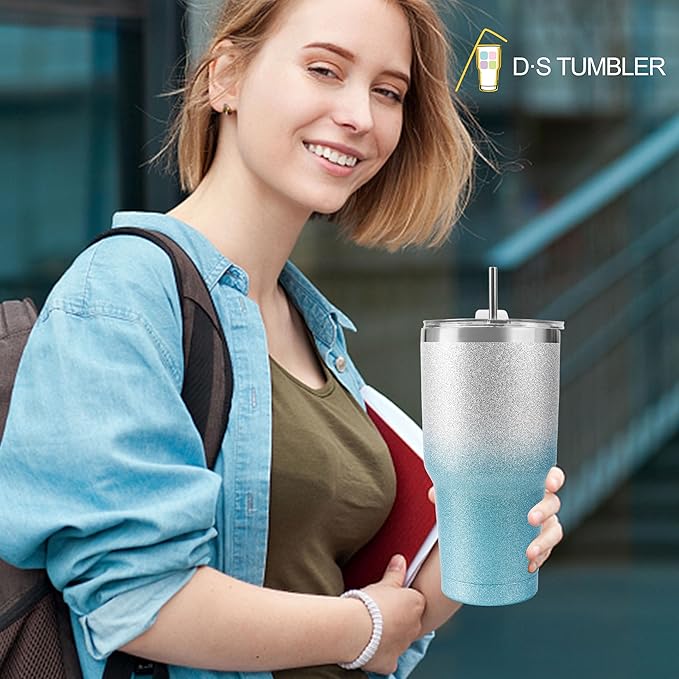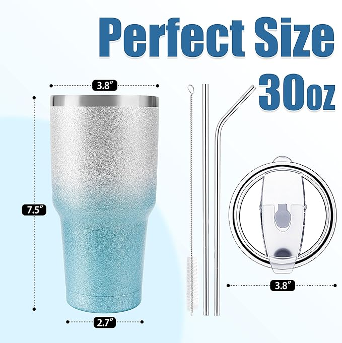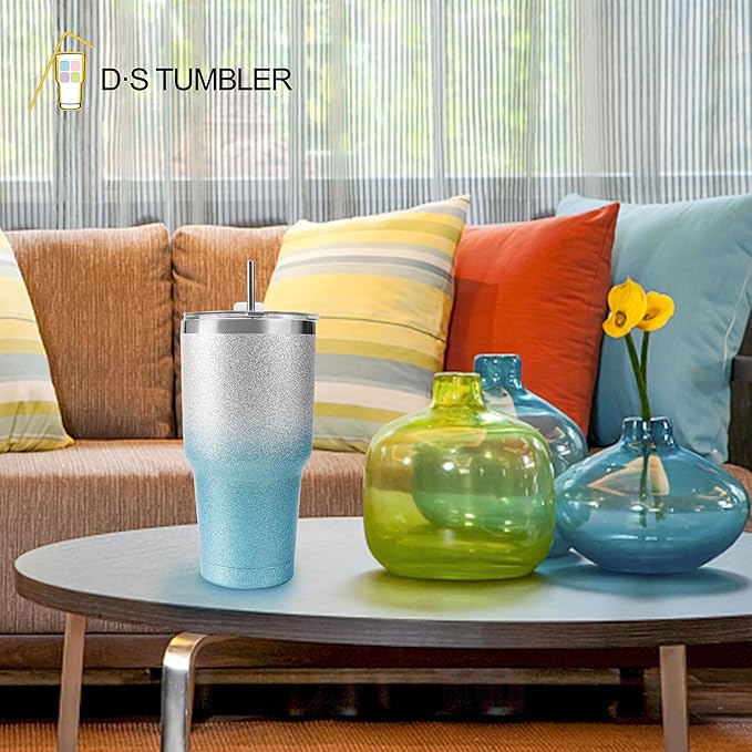D·S 30 oz Tumbler Blue Glitter Gradient Cup Stainless Steel Double Wall Vacuum Insulated Mug with Straw and Lid, Cleaning Brush for Cold and Hot Beverages