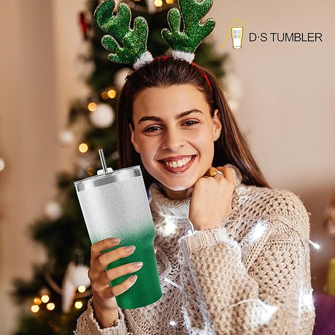 D·S 30 oz Tumbler Christmas Green Glitter Gradient Cup Stainless Steel Double Wall Vacuum Insulated Mug with Straw and Lid, Cleaning Brush for Cold and Hot Beverages
