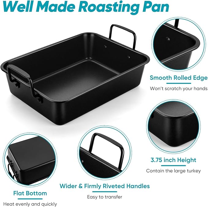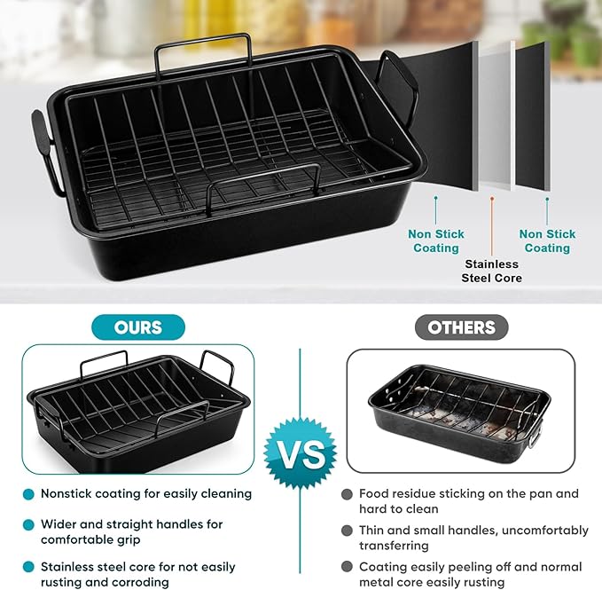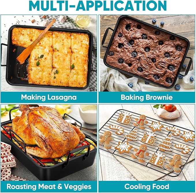TeamFar Roasting Pan, 16’’ Nonstick Deep Lasagna Brownie Turkey Pan with V-Shaped Rack & Cooling Rack, with Stainless Steel Core & Nonstick Coating, Healthy & Sturdy Handles, Easy to Clean, Set of 3