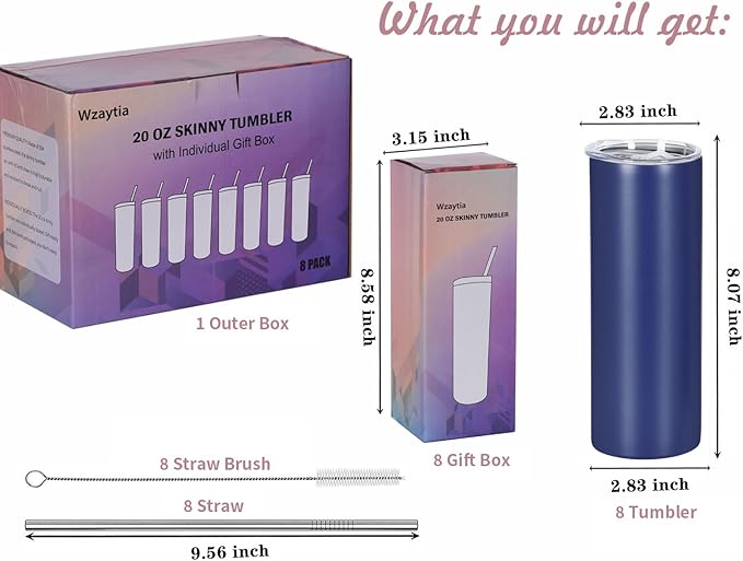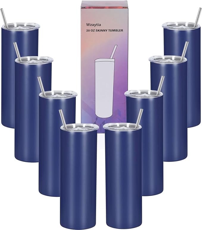 8 Pack 20 Oz Stainless Steel Straight Skinny Tumblers, Insulated Slim Thin Travel Cup Set for DIY, Navy