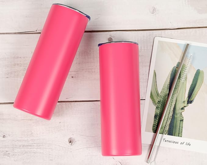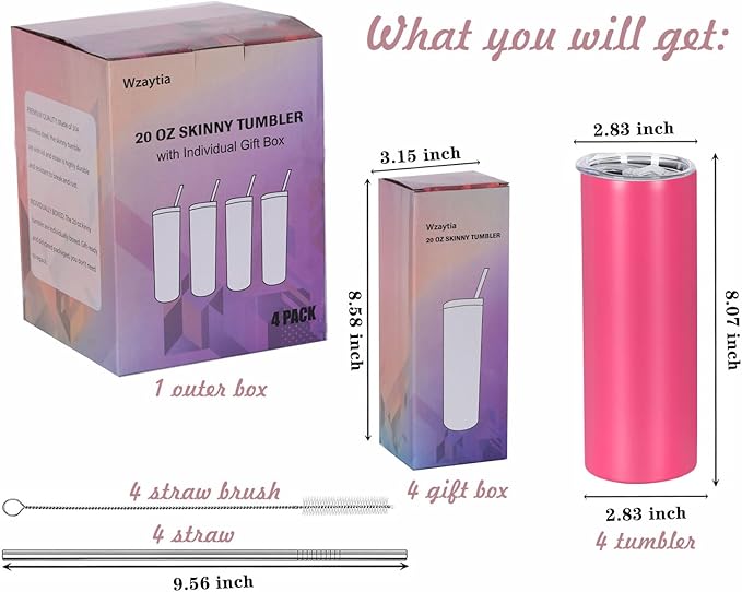 4 Pack 20 Oz Straight Skinny Tumblers,Individually Gift Boxed Stainless Steel Slim Skinny Tumbler Set Bulk, 20 Oz Insulated Slim Thin Travel Tumbler Cup for Diy,Hot Pink