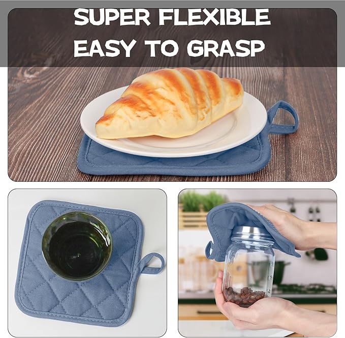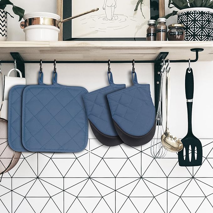 • 4 PIECE GREAT VALUE HOUSEHOLD ESSENTIALS PACK: Super value for 4pcs short oven mitts and pot holders, including 2 oven mitts(6.8 x 5.3in) and 2 pot holders (6.6 x 6.6in), perfect for daily use and coordinate well with your house and kitchen.