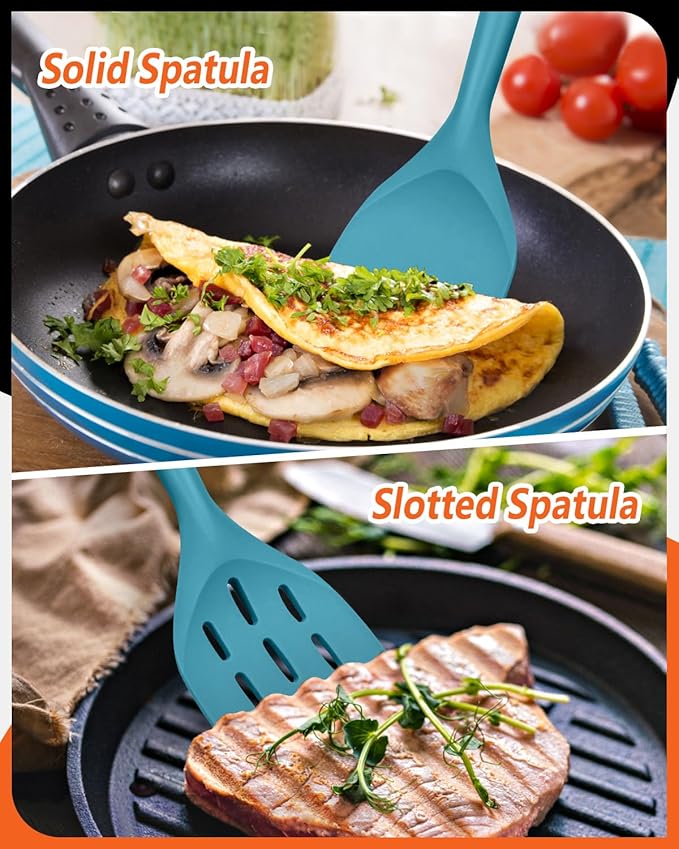 Pack of 2 Silicone Spatula, Non Stick Cooking Utensil Set Wooden Handle Kitchen Turner for Baking Mixing Grilling Serving Food Heat Resistant Non Scratch Hooks Included (Blue)