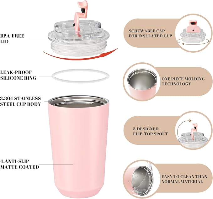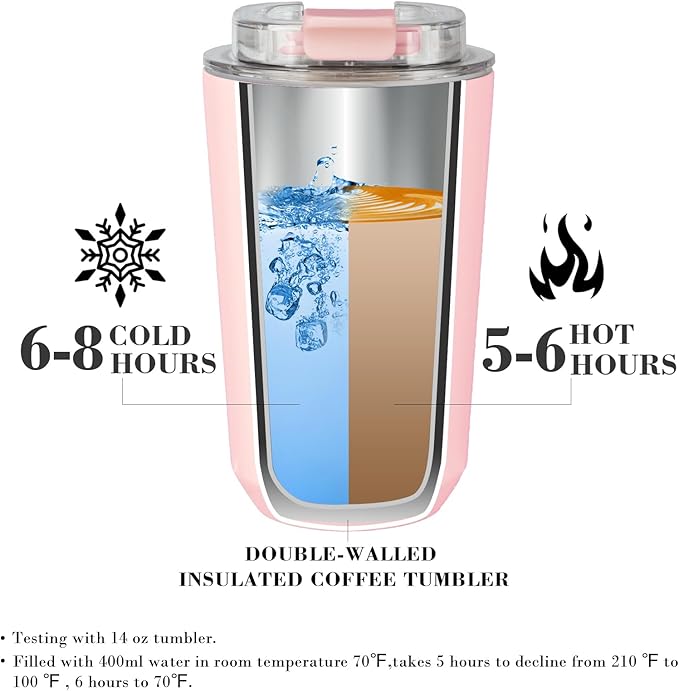 Puraville Insulated Tumblers with Lid, 14 oz Travel Coffee Mug Stainless Steel Vacuum Cup, Leak Proof Reusable Double Walled Coffee Tumbler for Iced and Hot Drinks, Pink