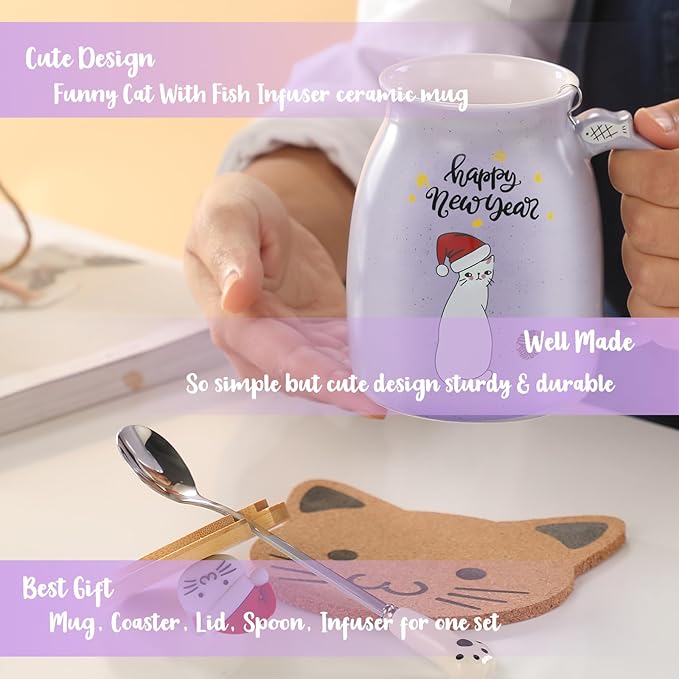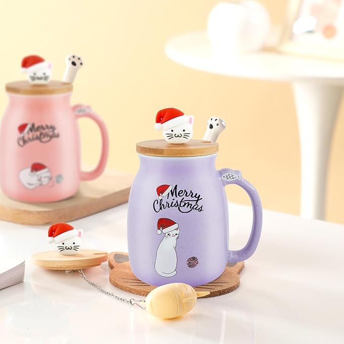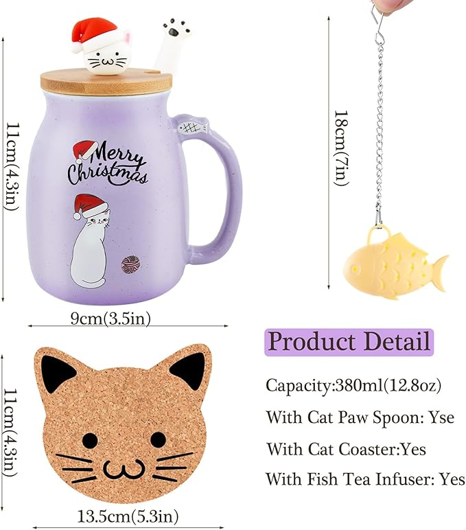 BigNoseDeer Christmas Mugs Kawaii Cat Mug Tea Cup with Infuser Cute Mugs Ceramic Coffee Mug with Lid, Spoon,Coaster Kitty Tea Mug Christmas Gifts Cat Lovers Gifts (Purple 13oz)