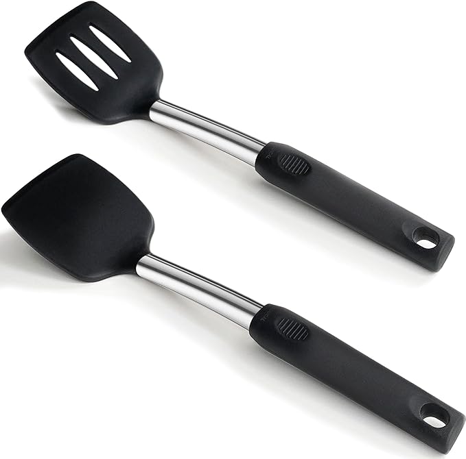 2 Pack Solid & Slotted Silicone Spatula Set, 600F Heat-Resistant No-Melt Handle and Blade, Kitchen Cooking Utensils for Nonstick Cookware, Spatula Turner for Egg,Pancake,Burger- Dishwasher Safe