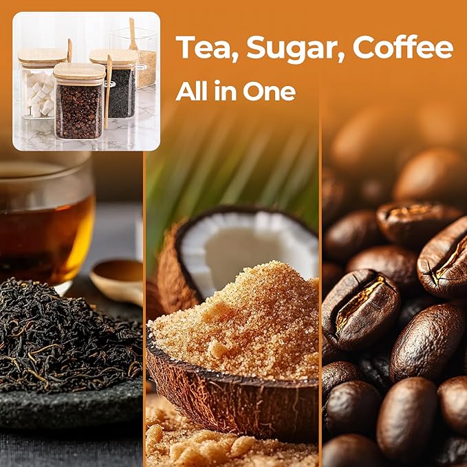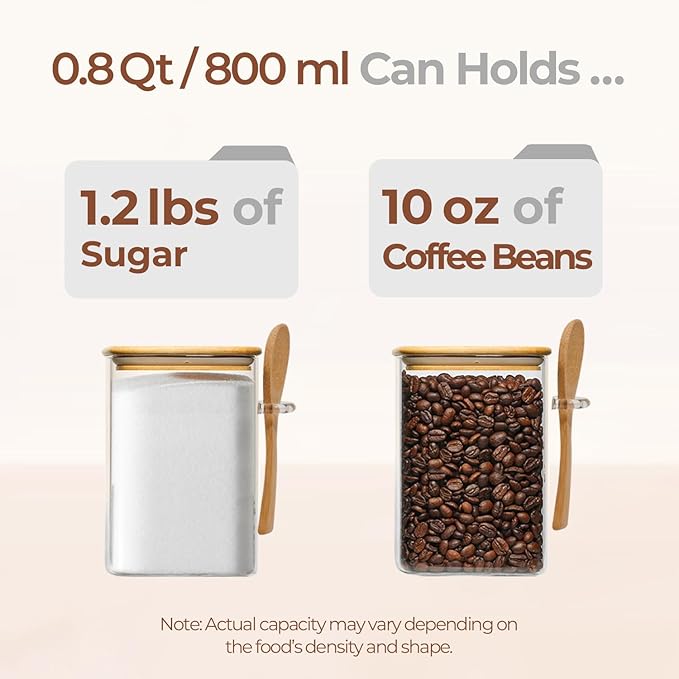 ComSaf 0.8 Qt Glass Jars with Bamboo Lids & Spoons Set of 4, Square Glass Containers with Lids, Sugar Coffee Containers Salt Spice Jars, Pantry Storage Container for Loose Tea, Candy, Brown Sugar, Nut