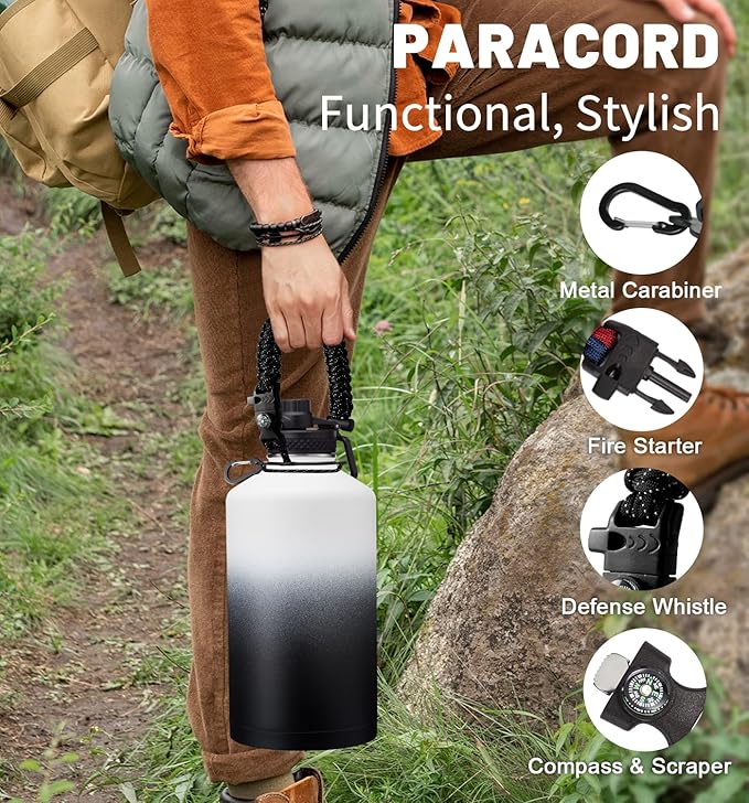 1 Gallon Insulated Water Bottle - with Straw & Auto Chug Lid, Paracord Handle, Bottle Sleeve, 128 oz Stainless Steel Water Bottle, Large Metal Gallon Water Jug Canteen for Sport Work