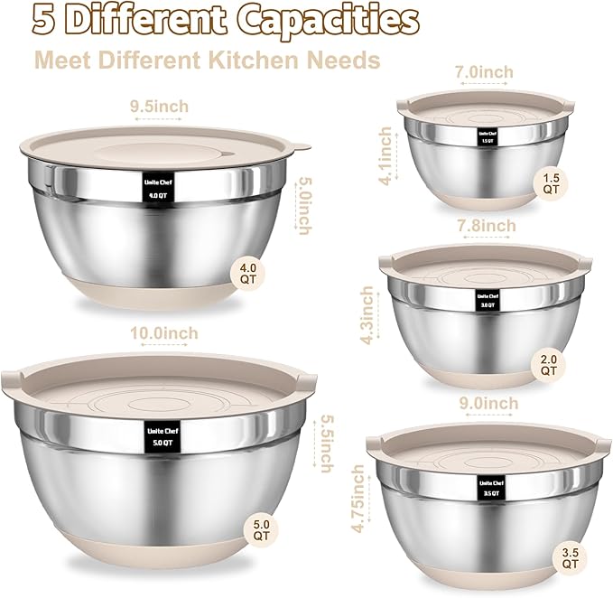 Umite Chef Mixing Bowls with Airtight Lids Set, 8PCS Stainless Steel Khaki Nesting Bowls with Grater Attachments, Kitchen Bowls with Non-Slip Bottoms, Size 5, 4, 3.5, 2, 1.5QT for Mixing & Serving