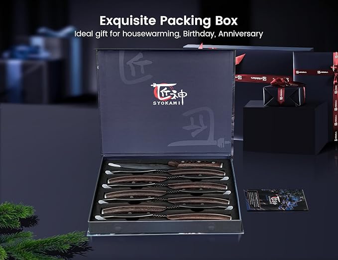 Steak Knives Set of 8, 4.8 Inch Carbon Steel Japanese Style Non Serrated Dinner knives with Wooden Handle, Damascus Pattern Full Tang Design, Housewarming Holiday Cooking Gifts