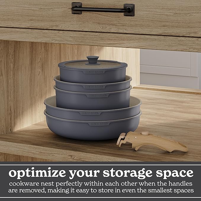 Country Kitchen Cookware Set with Removable Handle, Oven & RV Safe Pots and Pans Set, Grey/Ivory Wood Handle, Original