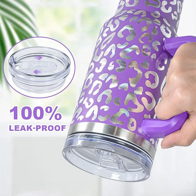 40 oz Tumbler with Handle and Straw, 100% Leak-Proof Travel Mug, Stainless Steel Double Wall Vacuum Insulated Coffee Cup Keeps Cold For 34 Hours, Dishwasher Safe, Purple Leopard