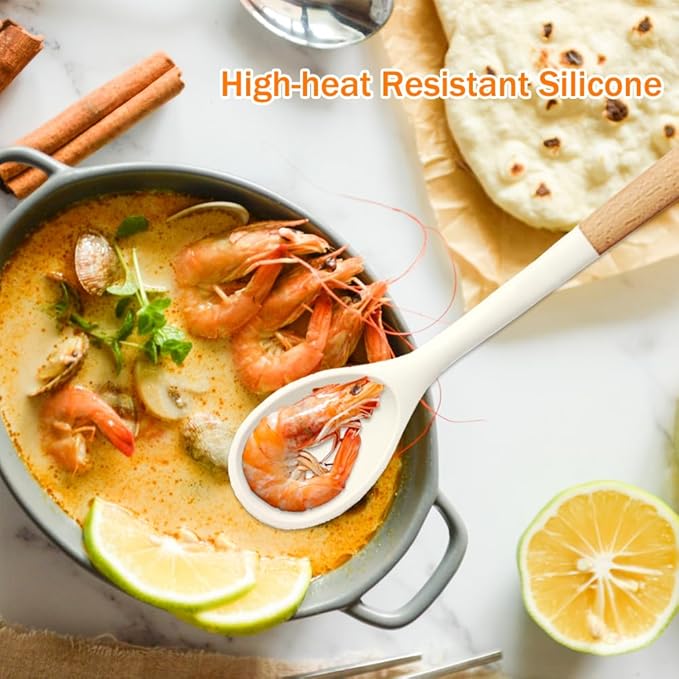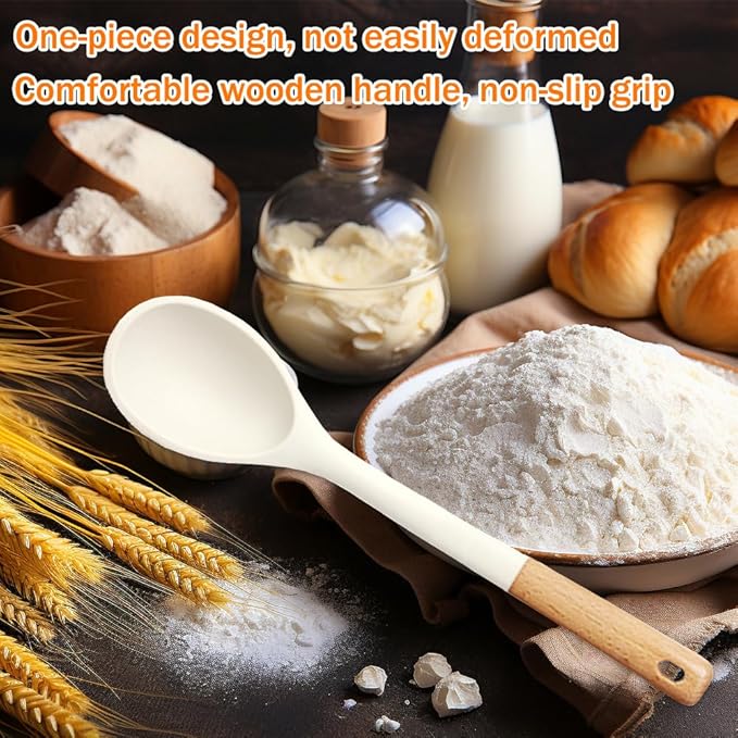 Large Silicone Cooking Spoons, Nonstick Solid Wooden Handle Kitchen Spoons, Heat Resistant Silicone Rubber Spoonula for Cooking, Serving, Basting, Mixing Tool, 13.2inch, Flexible Scraper (White)