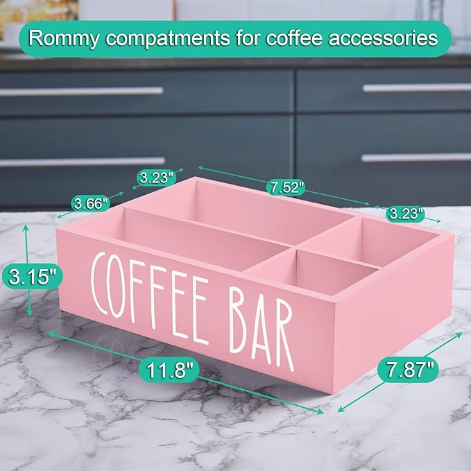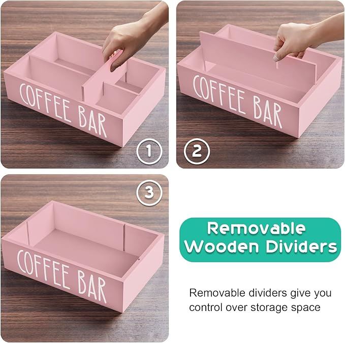 ALELION ALEION Coffee Station Organizer - Wood Countertop Accessories Organizer with Removable Dividers for Pods Condiment Syrup Tea Cups Stirrers - Pink Decor for Kitchen Coffee Bar