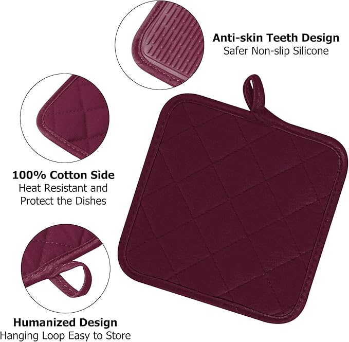 • COMFORT & SOFT COTTON FABRIC: Both oven mitts and potholders are made of durable neoprene and cotton, has 2-layer, with soft inner. Comfortable to touch, protect your hands from heat, steam and grease. Using in kitchen, stains are inevitable, but you can hand wash them with warm water and soap. Also they are machine washable.