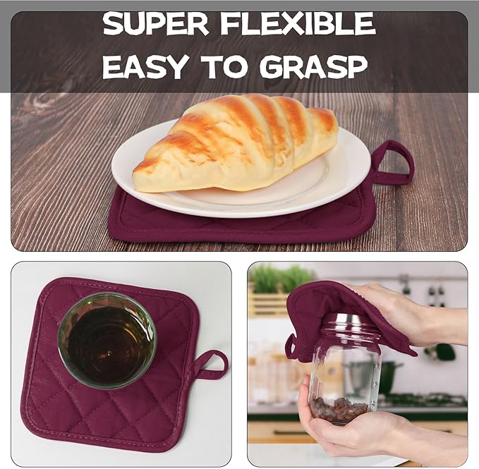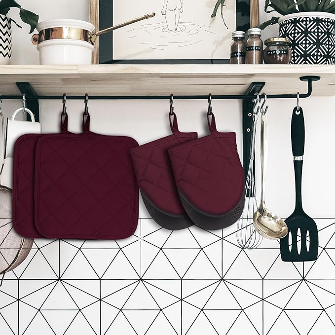 • 4 PIECE GREAT VALUE HOUSEHOLD ESSENTIALS PACK: Super value for 4pcs short oven mitts and pot holders, including 2 oven mitts(6.8 x 5.3in) and 2 pot holders (6.6 x 6.6in), perfect for daily use and coordinate well with your house and kitchen.
