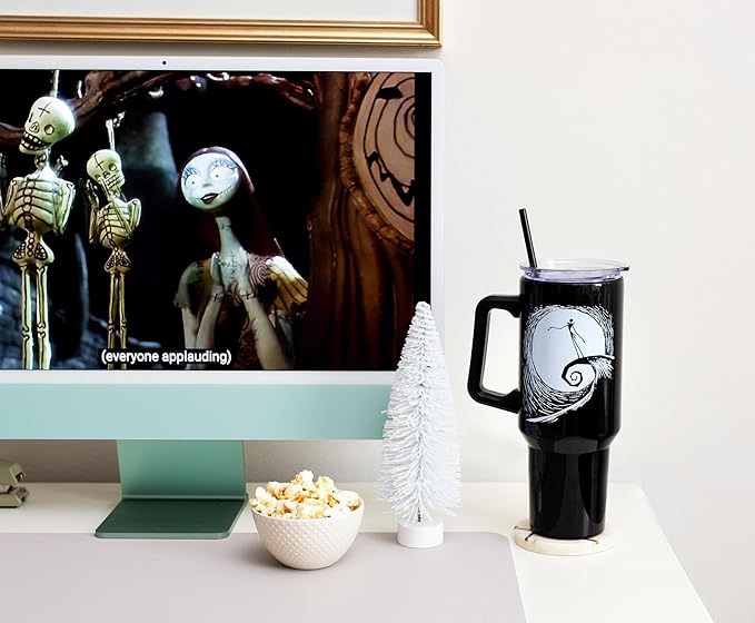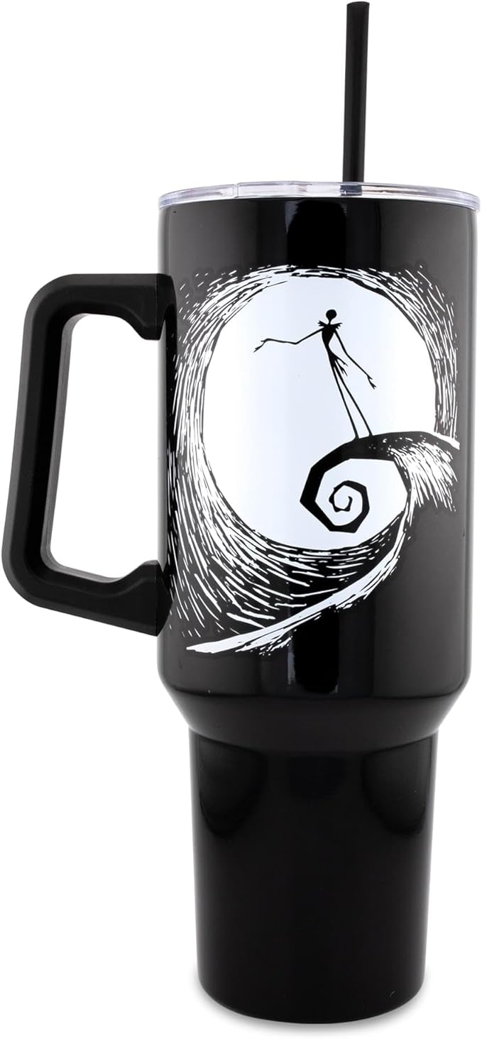 Silver Buffalo Disney Nightmare Before Christmas by Tim Burton Jack Skellington Hill and Moon Drawing Stainless Steel Tumbler with Handle and Straw, Fits in Standard Cup Holder, 40 Ounces