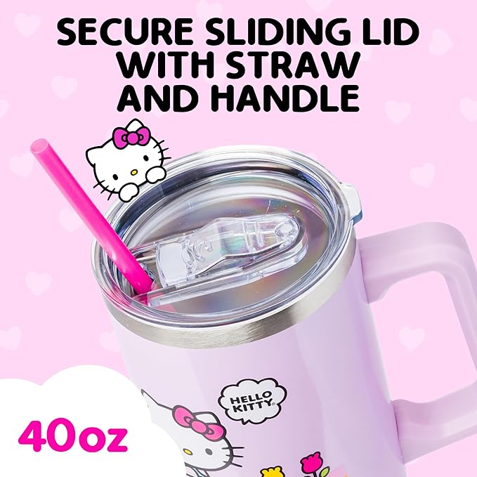 Silver Buffalo Sanrio Hello Kitty Spring and Summer Flowers Rainbow Stripes Stainless Steel Tumbler with Handle and Straw, Fits in Standard Cup Holder, 40 Ounces