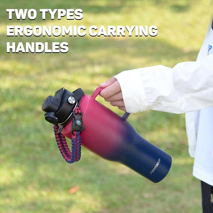 • 【VERSATILE FOR ANY OCCASION】ABOTOCUP insulated water bottle provide a different drinking experience with two lids that are fully leak-proof and designed for effortless drinking. Perfect for any indoor and outdoor activities. Come with ergonomic handle and Paracord handle with compass, safety ring that built for the toughest.