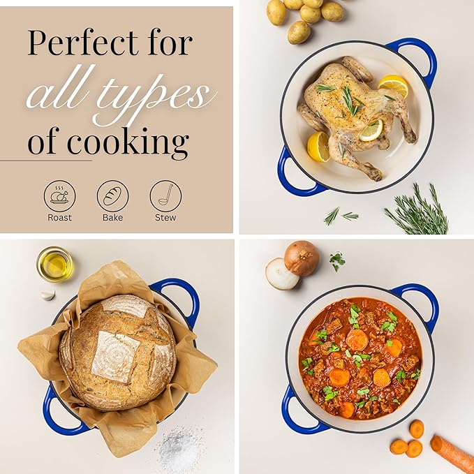 Nuovva Enamelled Cast Iron Dutch Oven Pot with Lid – 6.4 Quart Non Stick Casserole Pot – Heavy Duty & Oven Safe up to 500° F for Bread Baking, Braising, Stews, Roasting – 28cm Dark Blue