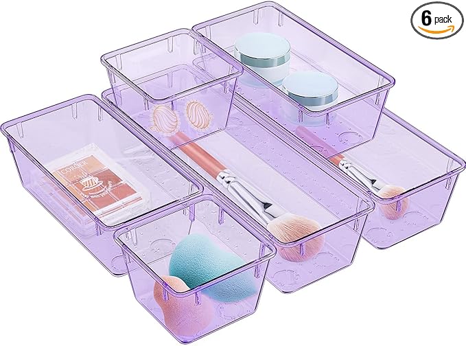 WOWBOX 6 Pack Clear Drawer Organizer Set, Acrylic Drawer Storage Trays, Storage Bins for Makeup, Cosmetics, Jewelries, Utensils, Gadgets, Office, Purple