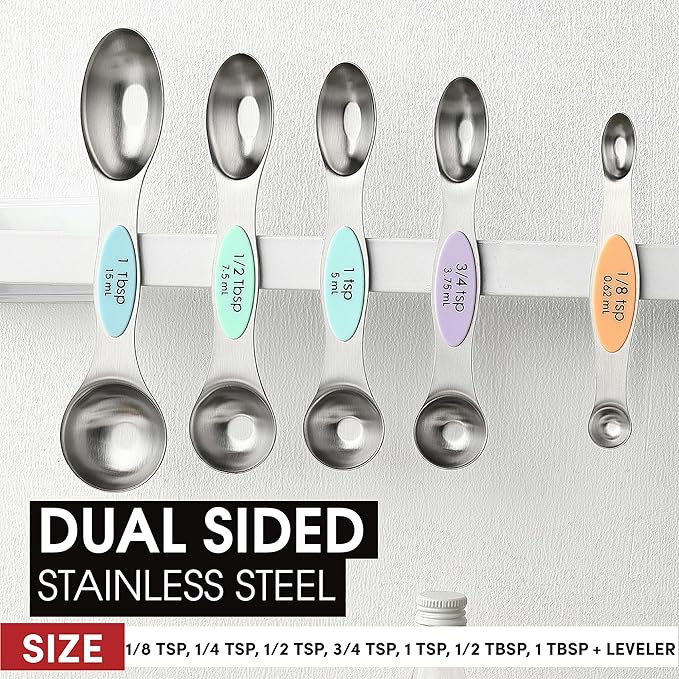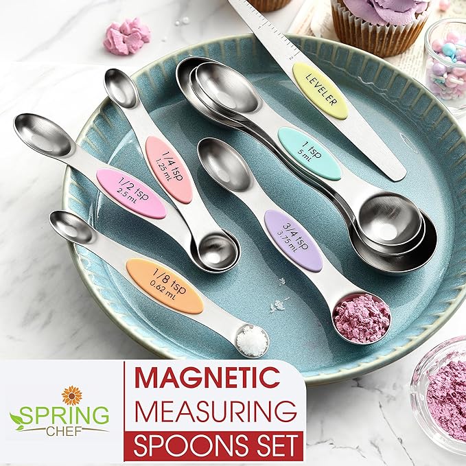 Spring Chef Stainless Steel Magnetic Measuring Spoons Set of 8 with Leveler, Metal Teaspoon & Tablespoon Measuring Spoons for Dry and Liquid Ingredients, Kitchen Gadgets for Baking & Cooking - Pastel