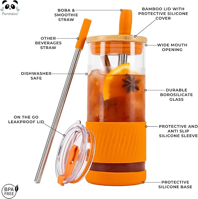Pandaloo® Glass Cups With Lids and Straws -20 Fl Oz- Perfect Size Iced Coffee Cup - Smoothie Cup With Bamboo Lid and On the go Lid - Glass Tumbler With Straw (1 Count (Pack of 1), Autumn Gold)